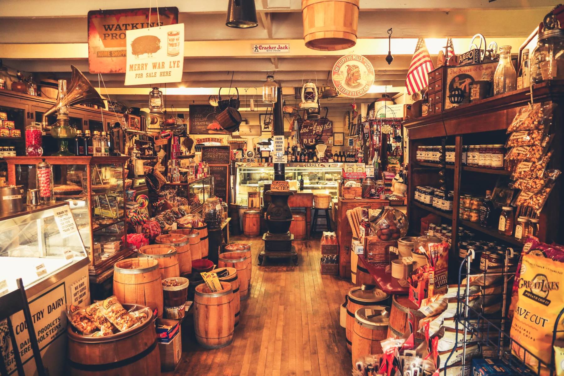 Ganz beschaulich fühlt es sich dagegen auf dem Finger an, der sich weiter nördlich in den See krümmt. Das schwingt schon im Namen Old Mission Peninsula mit. Hier wachsen Chardonnay, Riesling, Pinot Noir und die Bäume stehen träge ausladend Spalier am Straßenrand. An der Landspitze dann ein Unikat, wie es nur noch äußerst selten zu finden ist. Ein General Store, herausgefallen aus der Zeit. Drinnen riecht es alt und wild, das uralte Dielenholz knarzt behäbig, ein Kanonenofen vertreibt im Winter die bittere Kälte und es würde kaum verwundern, käme ein Trapper mit Biberfellmütze durch die Tür und verlangte Trockenfleisch und Munition.