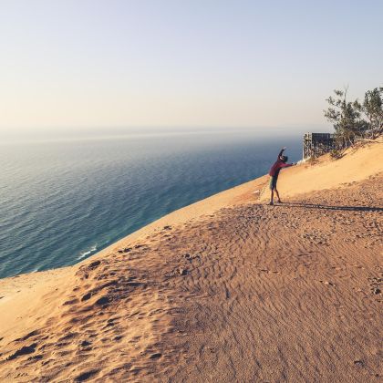 Der verheißungsvolle Ruf des mächtigen Lake Michigan lockte uns weiter nach Westen und bei Manistee stießen wir auf die Route 22 nach Norden. Eine typische Herbstfarben-Highlight-Landstraße mitten durchs Kirschenland mit weiß gestrichenen viktorianischen Dörfern, schrulligen Museen, die einen liebevoll staubigen Blick in ein früheres unschuldigeres Amerika gewähren, Cafés und Geschäften, in denen man die klebrig-süßen Resultate der Obstwirtschaft kosten und natürlich kaufen muss, von Geistern heimgesuchten Leuchttürmen, den See überragenden Aussichtspunkten. Womit wir wieder auf den Sleeping Bear Dünen angekommen sind. Und das hat so was von Ankommen, dass man sich die Klamotten vom Leib reißen und in den See springen will, ein letzter Sehnsuchtszucker Richtung Sommer. Aber das lässt du mal lieber bleiben, denn den 150 Meter runter ans Ufer würde ein nicht enden wollender Aufstieg folgen. Besser woanders die überschüssige Energie loswerden und schon geht es weiter auf den Empire Bluff Trail – schön treppauf treppab durch still wogenden Wald bis zum nächsten überragenden Blick über den See. Todsicher ist hier jemandem zum ersten Mal der Klischeespruch »In Amerika ist alles viel größer und weiter« über die Lippen gekommen.