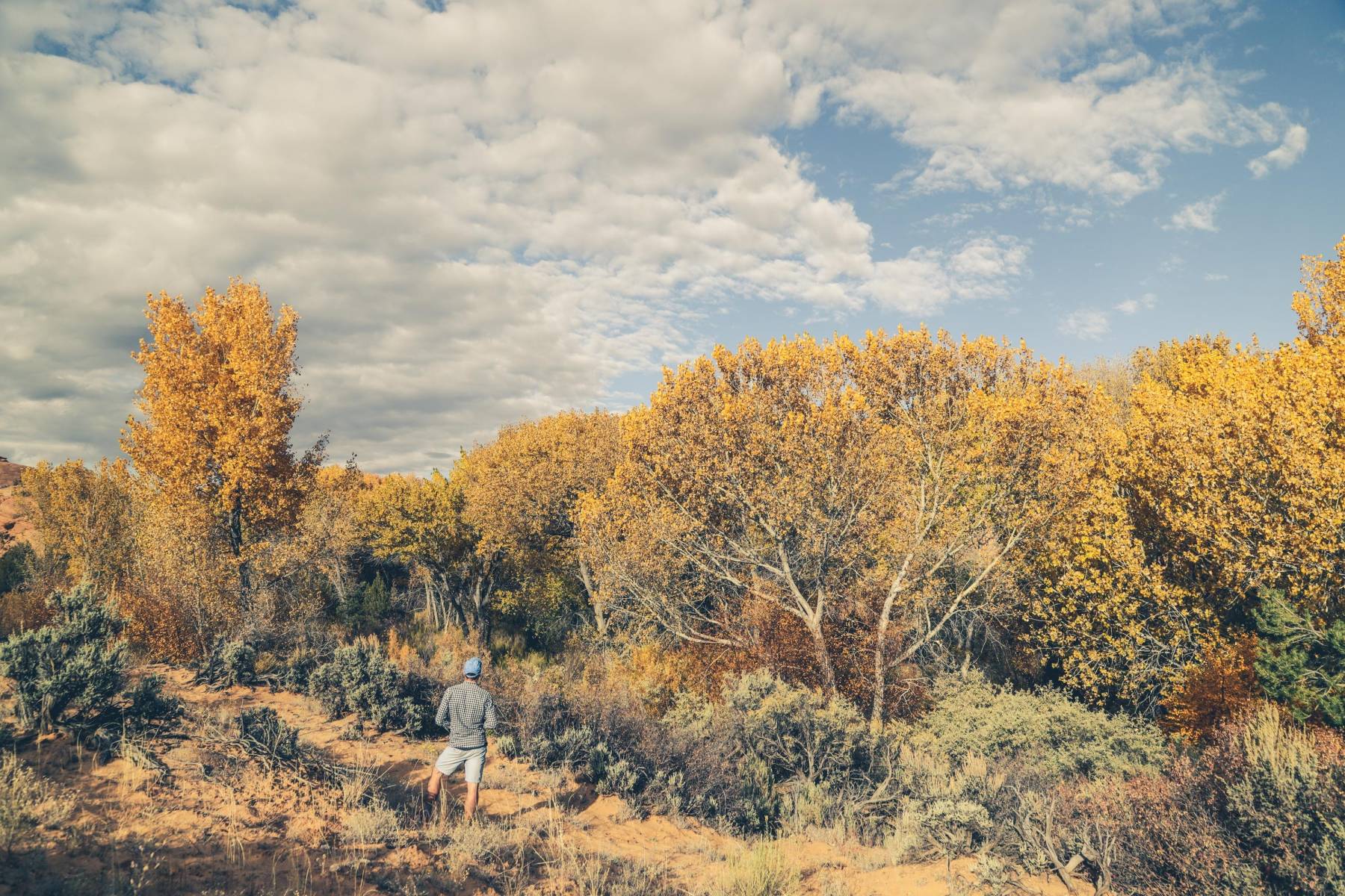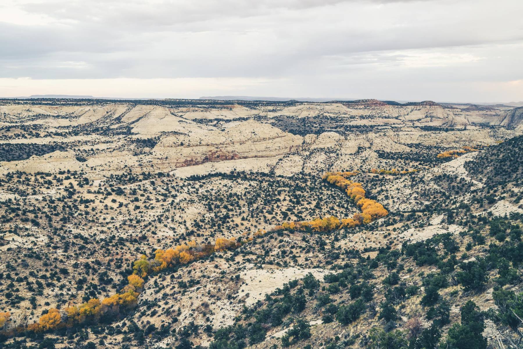 Alle paar Kurven wechselt die Landschaft. Cowboys treiben ihr Vieh auf die Weiden, die sich grün auf sanften Hügeln erstrecken. Plötzlich karge, rote Felswüste, die ein paar Meilen später in ein ausgewaschenes weißes Felsenmeer übergeht. Zwischen Boulder und Escalante balanciert der Highway waghalsig auf einem Bergkamm mit steil abfallenden Klippen zu beiden Seiten. Willkommen auf dem Hogsback. In von Bächen eingeschnittenen Rinnen leuchten Espen gelb und ziehen sich wie Adern durch die unwirkliche Landschaft.